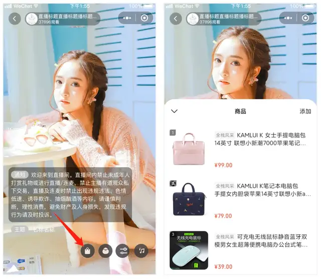 在视频号直播时,底部可挂载商家的小程序商品,用户点击购买即可直接跳转进入购买页面。